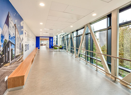 All departments connected back to the existing hospital at each level and a hospital street linking the existing entrance block to the new north block foyer formed a defined circulation spine culminating in a naturally ventilated and light filled public café which maximises view to the Lee valley. This nonclinical breakout space by visitors, staff and patients